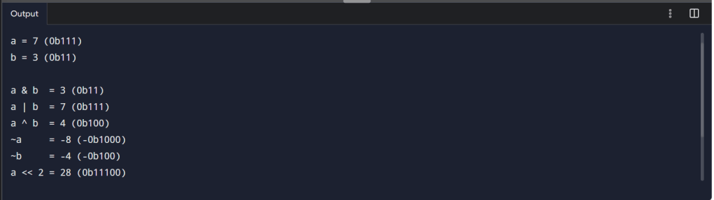 # Bit manipulation demo in Pythondef bit_operations(a: int, b: int): """Perform common bitwise operations on two integers.""" try: # Ensure inputs are integers if not isinstance(a, int) or not isinstance(b, int): raise ValueError("Both inputs must be integers.") print(f"a = {a} ({bin(a)})") print(f"b = {b} ({bin(b)})\n") # AND print(f"a & b = {a & b} ({bin(a & b)})") # OR print(f"a | b = {a | b} ({bin(a | b)})") # XOR print(f"a ^ b = {a ^ b} ({bin(a ^ b)})") # NOT print(f"~a = {~a} ({bin(~a)})") print(f"~b = {~b} ({bin(~b)})") # Left shift print(f"a << 2 = {a << 2} ({bin(a << 2)})") # Right shift print(f"a >> 2 = {a >> 2} ({bin(a >> 2)})") except ValueError as e: print(f"Error: {e}")# Example usageif __name__ == "__main__": bit_operations(7, 3) # 7 = 0b111, 3 = 0b011