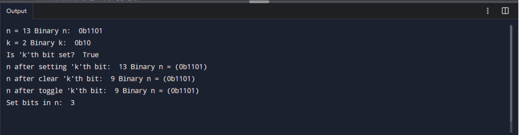 # Check if the k-th bit is set (0-indexed from right)def is_kth_bit_set(n, k): return (n & (1 << k)) != 0# Set the k-th bitdef set_kth_bit(n, k): return n | (1 << k)# Clear the k-th bitdef clear_kth_bit(n, k): return n & ~(1 << k)# Toggle the k-th bitdef toggle_kth_bit(n, k): return n ^ (1 << k)# Count set bits (Brian Kernighan’s Algorithm)def count_set_bits(n): count = 0 while n: n &= (n - 1) count += 1 return countn = 13k = 2print(f"n = {n} Binary n: ", bin(n))print(f"k = {k} Binary k: ", bin(k))print("Is 'k'th bit set? ", is_kth_bit_set(n,k))print("n after setting 'k'th bit: ", set_kth_bit(n,k), f"Binary n = ({bin(n)})")print("n after clear 'k'th bit: ", clear_kth_bit(n,k), f"Binary n = ({bin(n)})")print("n after toggle 'k'th bit: ", toggle_kth_bit(n,k), f"Binary n = ({bin(n)})")print("Set bits in n: ", count_set_bits(n))